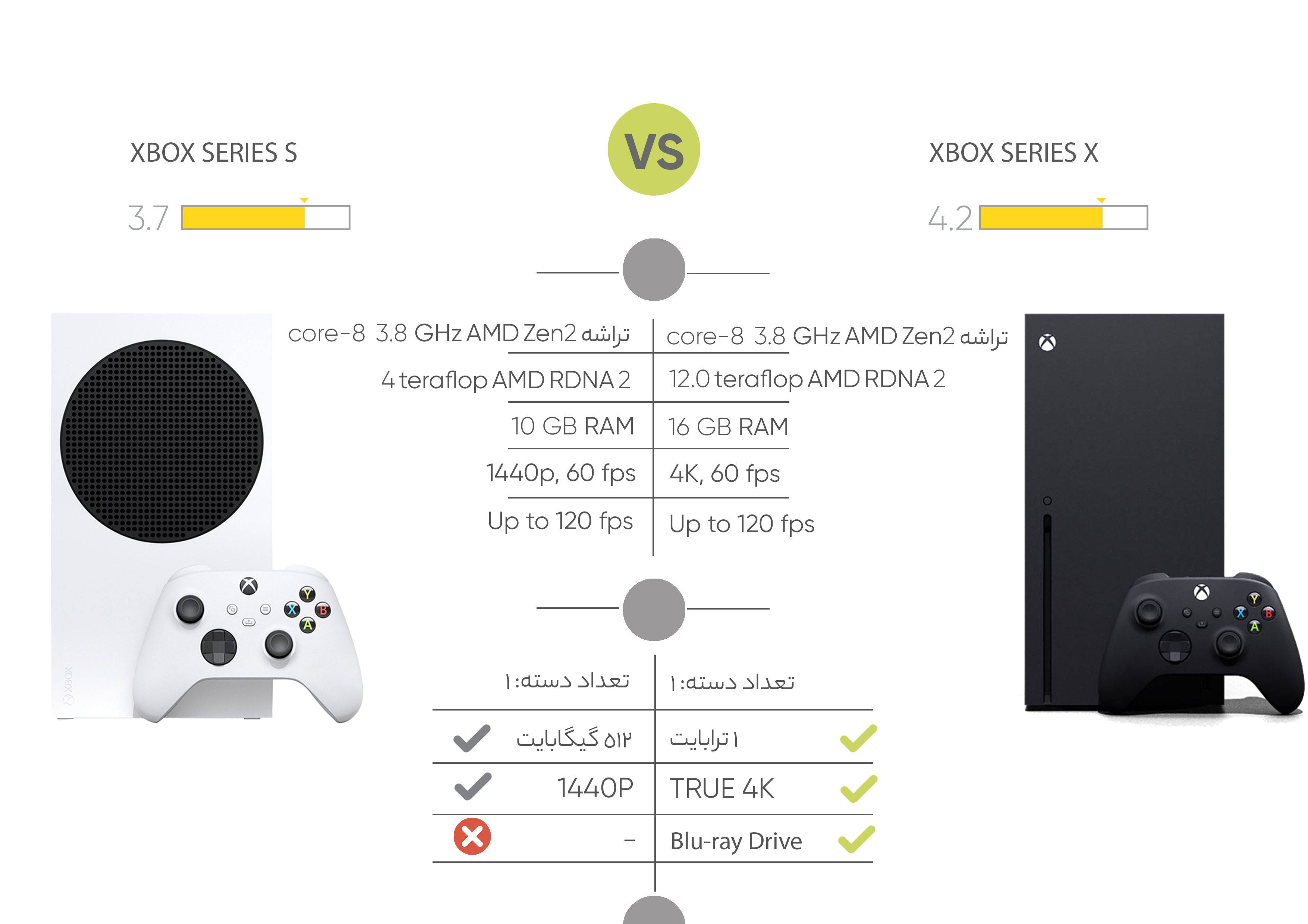 همان طور که گفتیم اول از همه ابعاد کوچک و جمعوچور این کنسول نظر ما را به خود جلب میکند. هر دو کنسول سونی و مایکروسافت یک نقطه ضعف بزرگ دارند و آن هم پشتیبانی نکردن از مانیتورهای فوق عریض است و تا به امروز این مسئله را حل نکردهاند. اولین نکتهای که در مقایسه XBOX series X و series S به چشم میخورد، تفاوتهایی از نظر سخت افزاری است و در کنسول series S با کنسولی ضعیفتر روبهرو هستیم که قدرتی در حدود 4 ترافلاپس دارد. همچنین حافظه داخلی series S حدودا 500 گیگابایت است. سری S درایو نوری ندارد و بیشتر مناسب افرادی است که بازیهای خود را دانلود کرده و به صورت دیجیتالی خریداری میکنند و خیلی به آرشیو کردن بازیها علاقهای ندارند. پس برای تجربه بهتر بازیها همچنین آیندهنگری در مورد پشتیبانی از 4k و 120 هرتز، بهتر است XBOX series X را خریداری کنید. اگر عاشق ایکس باکس و تجربه بازیهای هیجان انگیز هستید در عین حال هزینهای که انجام میدهید مهم است، ایکس باکس series S انتخاب مناسبی برای شما است.
